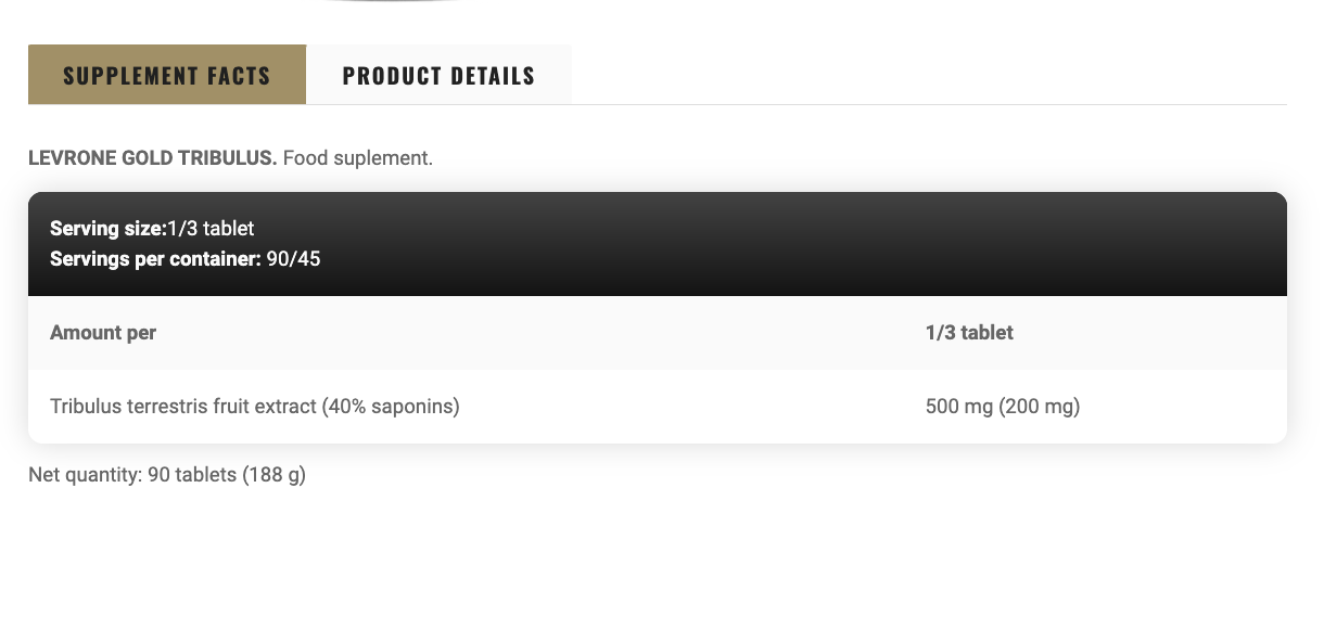 LEVRONE GOLD TRIBULUS tablets are a handy source of a high class Tribulus terrestris extract. The extract used in the supplement is standardized to 40% of valuable steroid saponins content. The plant is believed to have a valuable effect on physically active people and a number of beneficial properties for keeping the body in good condition. The product is recommended for beginners and experienced athletes. The formula is ideal when combined with other T-boosters, recovery support supplements or plant adaptogens.