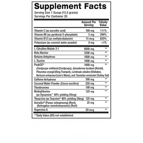 Mix one scoop with 250-300 ml of water and consume 15-30 minutes before training. Start with a half scoop to assess tolerance.